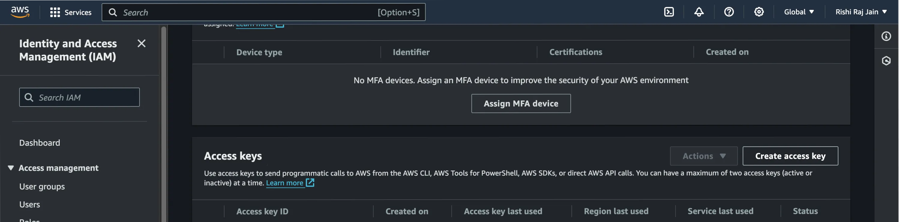 Scroll down to **Access keys** and click on **Create access key**.